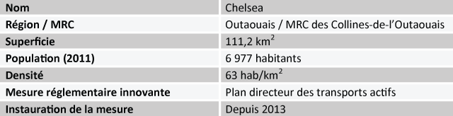 - AECOM et CHELSEA (municipalité de). Plan directeur du transport actif. (2013, août).