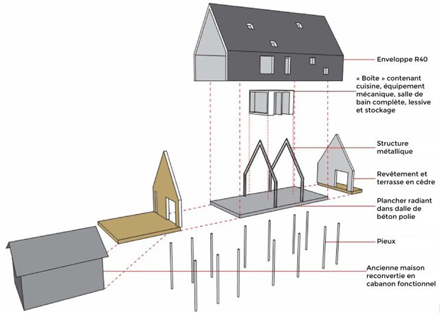 Pour en savoir plus sur cette conception innovante, nous avons contacté Simon Auger, chez Maisons Éléments. L'entrepreneur général situé en Estrie met actuellement au point un concept de boîte fonctionnelle similaire. « Le module réunit la cuisine, la salle de bain et tous les éléments mécaniques, ventilation, chauffage, plomberie, panneaux électriques, etc. ». Selon le directeur général et gestionnaire de projets, ce module préfabriqué conçu avec des logiciels de modélisation permet de réduire les coûts de construction: « on peut donc investir plus au niveau de l'enveloppe passive. Aussi, il peut s'adapter à n'importe quel projet et on peut le livrer n'importe où ». Un choix de design est également offert aux clients: « nous offrons actuellement trois options, ce qui permet au client de faire un choix », précise Simon Auger. Maisons Éléments en est à ses débuts, le module intérieur n'est pas encore présenté sur son site web à ce jour.