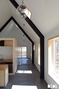 L’espace de vie est simple et minimaliste. Deux matériaux dominent l'atmosphère intérieure: les châssis structurels d’acier et une « boîte » interne en bouleau qui abrite tous les éléments fonctionnels de la maison: cuisine, équipement mécanique, salle de bain complète, lessive et stockage.