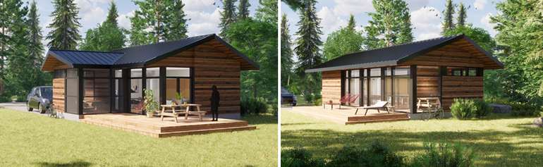 - L’Abri 750-BV est un modèle de style loft qui compte une belle grande chambre à coucher des maîtres. Avec sa terrasse intime en option, cette petite maison fait une grande place à la lumière et à la vue extérieure avec un côté entièrement fenestré.