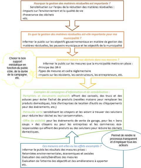 Les mesures de réduction à la source ont une portée limitée et doivent être combinées aux mesures de réemploi, de recyclage et de valorisation des déchets afin d’atteindre les objectifs gouvernementaux. Il faut aussi maximiser les campagnes de sensibilisation et d’information, car ce seront elles qui feront la différence. Par ailleurs, si la municipalité montre qu’elle réduit aussi ses propres déchets, elle peut devenir un leader en la matière et inciter ses citoyens à faire de même.