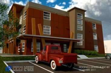 Il semblerait bien que ce soit une première: une résidence multilogement en bois massif, et lamellé-croisé sil vous plaît, dont la construction sera subventionnée par la Société d'Habitation du Québec (SHQ) et par le Bureau de l'Efficacité energétique (ministère des Ressources naturelles et de la faune). Ces panneaux sont 100% québécois, fabriqués par Nordic bois d'ingénierie.