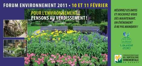 La Fédération interdisciplinaire de l’horticulture ornementale du Québec (FIHOQ) est heureuse d’annoncer la tenue de son Forum en environnement 2011. Cet événement important, qui aura pour thème Pour l’environnement… pensons au verdissement!, se tiendra les 10 et 11 février 2011 à l’Hôtel Delta de Trois-Rivières.