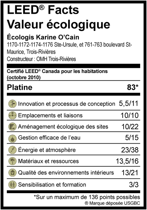 Le projet Karine- O'Cain porte ce nom pour rendre hommage à une militante décédée du cancer qui était très engagée auprès des organismes mauriciens COMSEP et ECOF. Il a été construit dans un quartier populaire de Trois-Rivières, à l’emplacement d’un bâtiment qui avait brûlé en 2004. C’est un projet à vocation sociale puisqu’il accueille principalement des personnes seules et offre des loyers abordables. Alors que l’OMHTR voulait faire de ce projet une vitrine du développement durable et y implanter des technologies difficiles à rentabiliser, le système de pointage LEED a donné un cadre de référence intelligent et réaliste qui a permis d’investir les efforts là où ils seraient les plus payants. Le menu écologique du projet initial a ainsi été dégraissé sans pour autant nuire aux objectifs environnementaux visés qui ont été atteints avec des investissements moindres que ceux prévus au départ. L’immeuble a finalement été conçu par l’architecte Daniel Bédard en collaboration avec le service technique de la Société d’habitation du Québec (SHQ) et ce, avec un budget total de près de 800 000$.