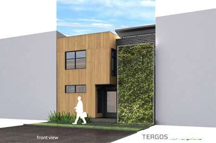 Le projet compte aussi un mur végétal qui permet de faire une transition progressive entre la maison et la rue en créant un espace sécurisant où la famille pourra entreposer poussette ou vélos. Ce mur végétal rafraîchira aussi la maison en été et offrira une zone tampon pour atténuer les bruits de la rue.