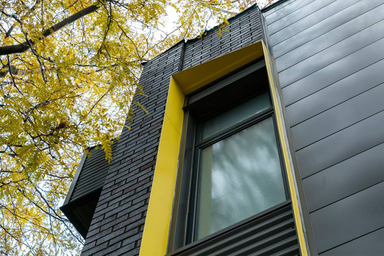 L’esthétique de la façade exprime l’organisation et les fonctions des niveaux par l’alternance entre ses surfaces opaques et ses ouvertures. Ce rythme très sobre et régulier est modulé par l’utilisation de matériaux contrastants tels qu’un parement de maçonnerie foncé et de l’acier galvanisé très clair. Les interventions sur la maison améliorent l’efficacité énergétique du bâtiment par la réalisation de travaux d’isolation des murs existants et l’intégration d’un système de récupération de chaleur, en plus de la conception d’un espace traversant pour une ventilation naturelle durant les saisons plus chaudes, et la mise en place d’un brise-soleil contrôlant les gains thermiques de façon passive.