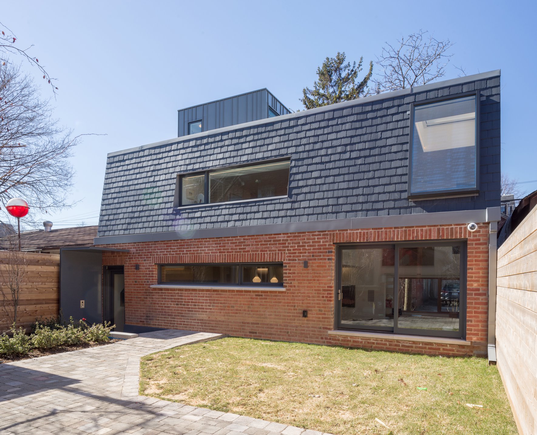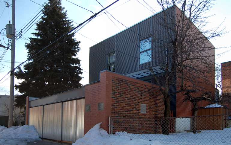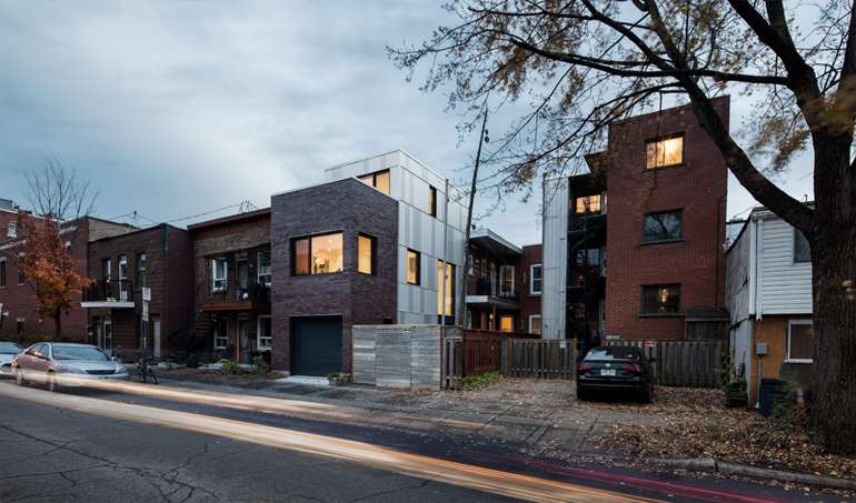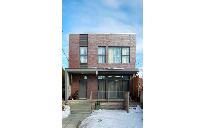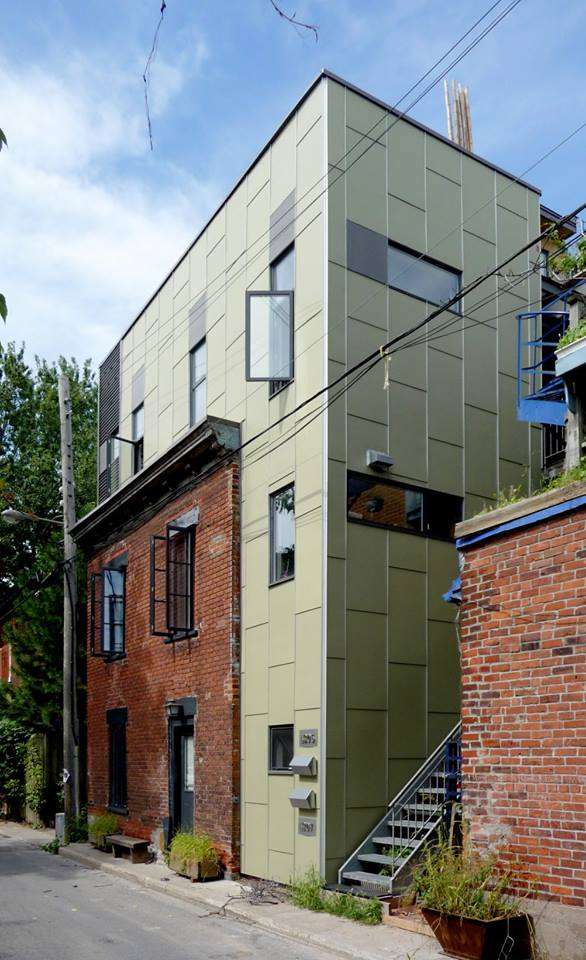 Ce projet compact sur le Plateau à Montréal consiste en l’ajout d’un troisième étage et d’une mezzanine sur un petit cottage en brique de 22 par 20 pieds à deux étages ne comportant presque aucun terrain. L’aménagement prévu intègre la directive principale de créer 2 logements séparés de sorte à combler les besoins de proximité et d’indépendance des membres d’une famille. Toutes les composantes architecturales de la maison existante telles que corniche, type de fenestration et maçonnerie sont conservées et restaurées. L’ajout du troisième étage et de la mezzanine, qui doublent la hauteur de la maison, sont développés de manière à se distinguer tout en mettant l’existant en relief. L’utilisation de nouveaux matériaux tels que panneaux de fibrociment posés en bardeaux et acier corrugué gris fer créée un dialogue de contraste avec la brique rouge de la maison d’origine. L’approche générale au projet est également orientée vers l’application de stratégies durables telles que l’utilisation de matériaux récupérés, recyclables, durables et sains ainsi que le détournement des matières résiduelles vers des centres de récupération.