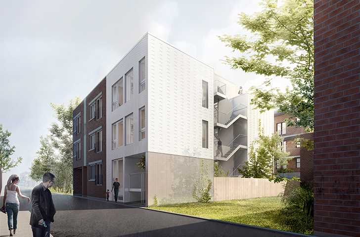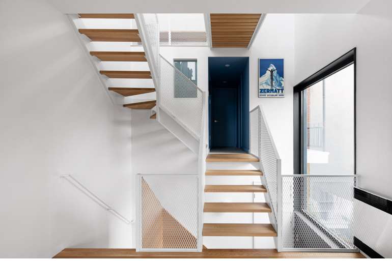 Variation inattendue sur le thème du triplex montréalais, le projet signé Microclimat Architecture et Construction comporte deux petites unités de 2 étages, accessibles du rez-de-chaussée, un logement d’un seul niveau, au premier étage, et un quatrième logement avec mezzanine donnant sur le toit |