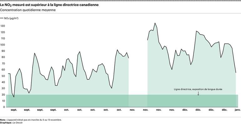 À noter que Le Devoir précise que l’air de Montréal en hiver contient en moyenne une concentration d’environ 20 µg/m3 de NO2, avec certaines journées à 40 µg/m3 majoritairement dans les quartiers plus pollués.