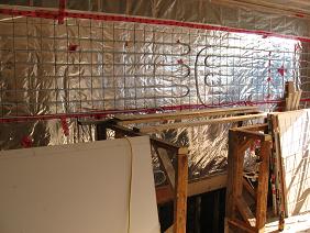 Vous devriez donc envisager l'installation d'un chauffage d'appoint à l'étage. Si vous souhaitez utiliser un seul système de chauffage, soit le chauffage radiant, vous pourriez construire des murs radiants (voir photo) ou encore un plancher radiant à l'étage. Dans ce dernier cas, il vous faudra couler environ un pouce de béton à l'étage. Plus cher à l'installation, ce système a beaucoup d'avantages: il est confortable, vous permet de bénéficier du principe de la masse thermique, et vous permettrait d'éliminer le coût d'un couvre plancher dans le cas où vous polissez le béton.