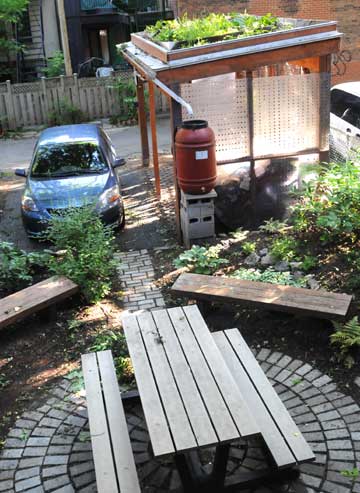 À défaut d'utiliser des briques récupérées pour construire un mur, elles peuvent très bien servir dans un aménagement paysager, comme le montre la photo de la cour du Centre d'écologie urbaine ci-dessous.