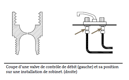 L'esthétique du robinet pourrait vous pousser à privilégier soit un aérateur soit une valve de réduction de débit (voir photo et illustration) si vous avez un robinet standard, l'aérateur fera le travail. Pour un robinet dont vous convoîtez l'esthétique mais dont l'embout ne permet pas l'installation d'un aérateur, une valve de contrôle de débit constitue une solution de rechange.