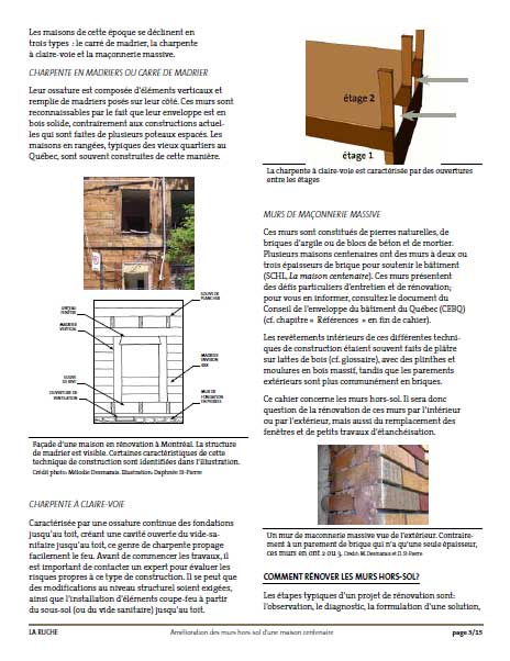 Nous vous invitons à consulter le Cahier de projet : Amélioration des murs hors-sol d'une maison centenaire. Ce cahier contient plusieurs photos, illustrations et dessins techniques, tel que le montre la page ci-dessous. Une rénovation efficace avec des matériaux écologique vous permettra de réduire votre consommation d'énergie et vos émissions de gaz à effet de serre (GES).