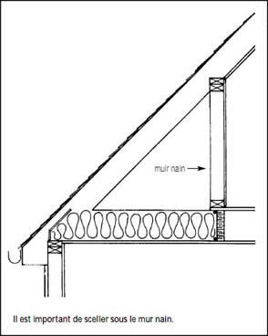 Les entretoits de ce type tendent à être difficiles à bien isoler car ils renferment souvent des sections peu accessibles. Vous mentionnez un mur d'une hauteur de 2 pieds avant le début de la pente. Ce type de mur, appelé mur nain, dissimule une section de l'entretoit, tel qu'illustré ci-dessous.