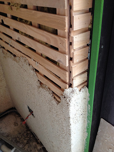 Voici pourquoi l'enduit de chanvre et chaux est approprié pour la restoration : il est perméable aux échanges gazeux. Il laisse passer la vapeur d'eau et les gaz à l'échelle microscopique, mais pas les courants d'air. Il répond même très bien aux tests d'infiltrométrie. L'application à la truelle permet de couvrir le support dans sa totalité, jusque dans les petits racoins, et de couper les ponts thermiques pour une isolation constante de R2 au pouce.