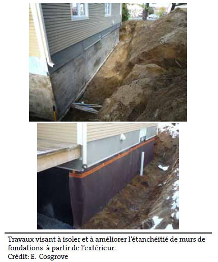 Dans notre Cahier de projet #4 - Rénovation d'un sous-sol ou d'un vide sanitaire, nous abordons en détail les travaux d'étanchéisation. De manière générale, nous avons constaté que pour régler définitivement les problèmes d'humidité, il est idéal de rénover par l'extérieur. Ceci est toutefois plus cher et implique plus de dérangements (il faut creuser une tranchée autour de la maison, rendant l'accès à l'intérieur plus difficile et détruisant une partie de votre amémagement extérieur, voir photos ci-dessous).