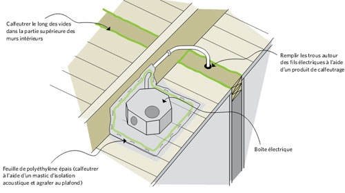 Un pare-vapeur (polyéthylène) peut être installé autour de boîtier électrique d'un luminaire. Il faut bien l'étanchéiser avec un scellant acoustique (mastic), tel qu'illustré ici :