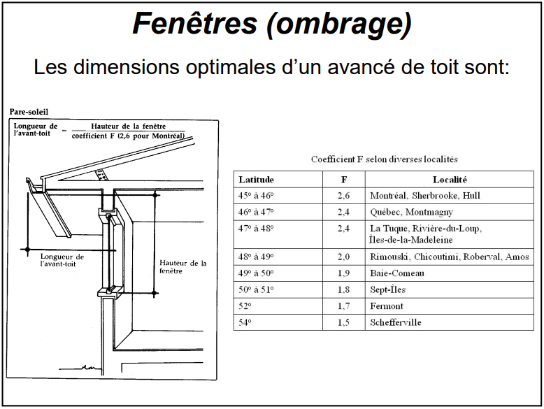 Ci-dessous une figure qui donne le calcul à effectuer des dimensions de l'avancée de toit optimal, selon la latitude :