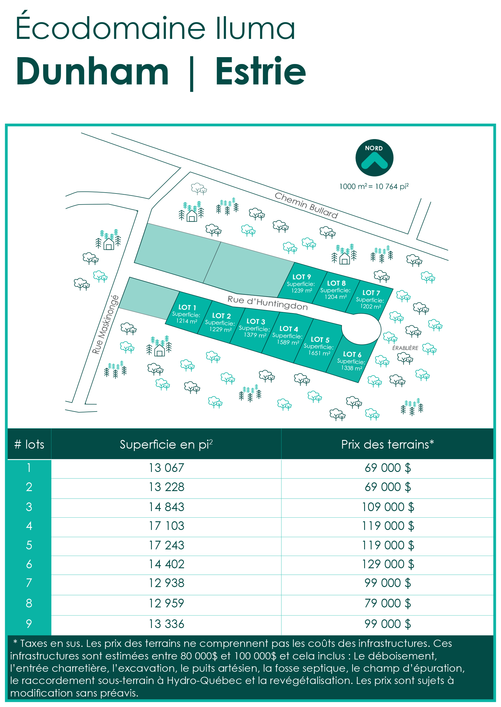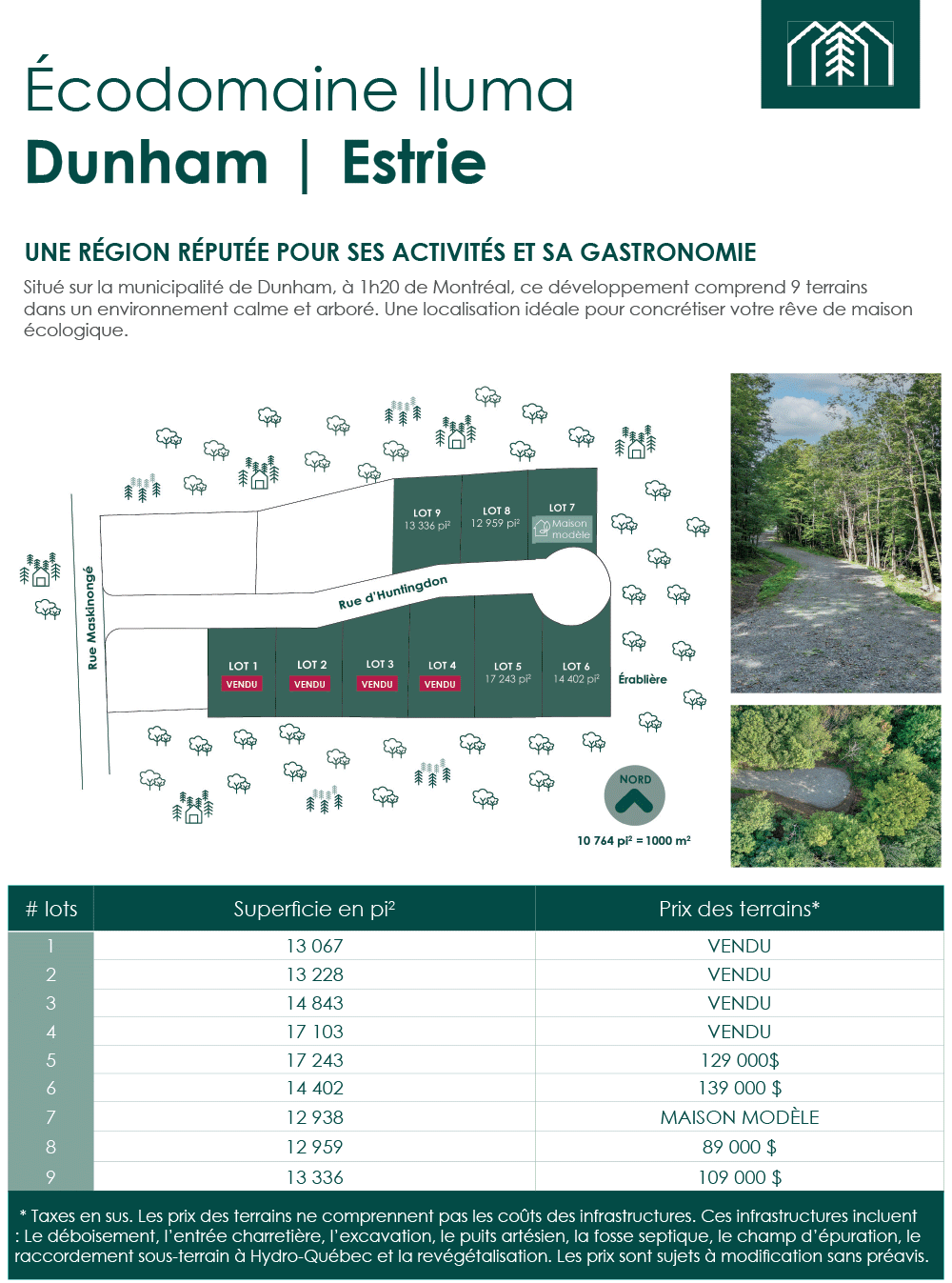 Situé en Estrie, au cœur des Cantons de l’Est, l’Écodomaine Iluma Dunham propose 9 terrains à partir de 12 000 pieds carrés. Bordé par une érablière, ce développement généreusement arboré jouit en prime d’une localisation idéale puisqu’il est situé à moins de 1h30 de Montréal. Avec plus de 365km de circuit sur routes et de pistes cyclables ainsi que les Monts Sutton et Bromont à moins de 30 min, la ville de Dunham est au cœur d’une région dynamique, été comme hiver !
