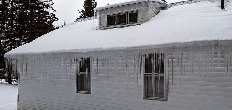Barrière de glace sur la toiture, possiblement le signe d'un manque d'isolation ou d'étanchéité.