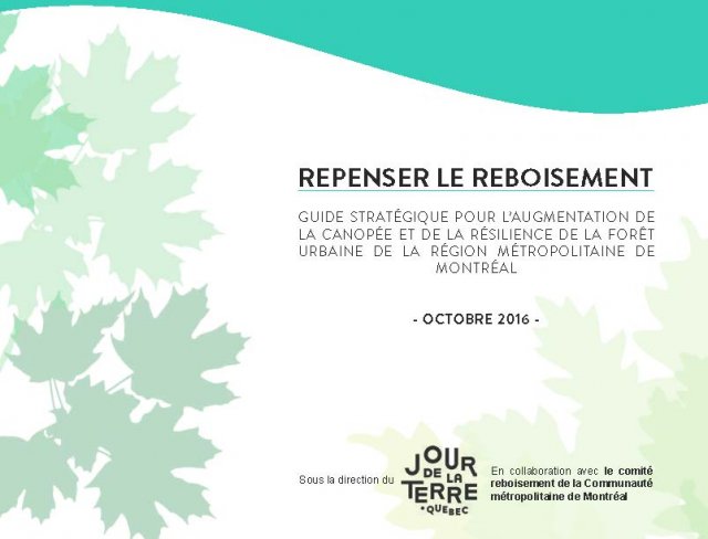 En collaboration avec le comité reboisement de la Communauté métropolitaine de Montréal, le Jour de la Terre a repensé le reboisement. Le guide oriente sa stratégie pour la région métropolitaine de Montréal, mais les principes généraux peuvent s’appliquer à d’autres municipalités québécoises.