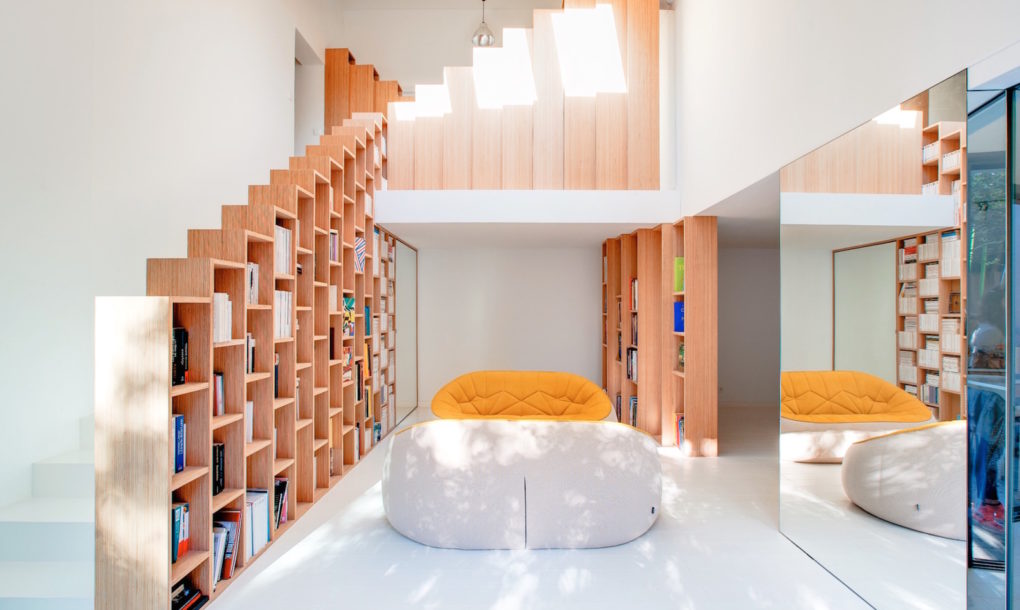 Posez un meuble sur mesure ou intégrez des tablettes sur la partie inférieure (ou supérieure) des escalier de manière à ajouter une bibliothèque, du rangement ou un petit espace de bureau.