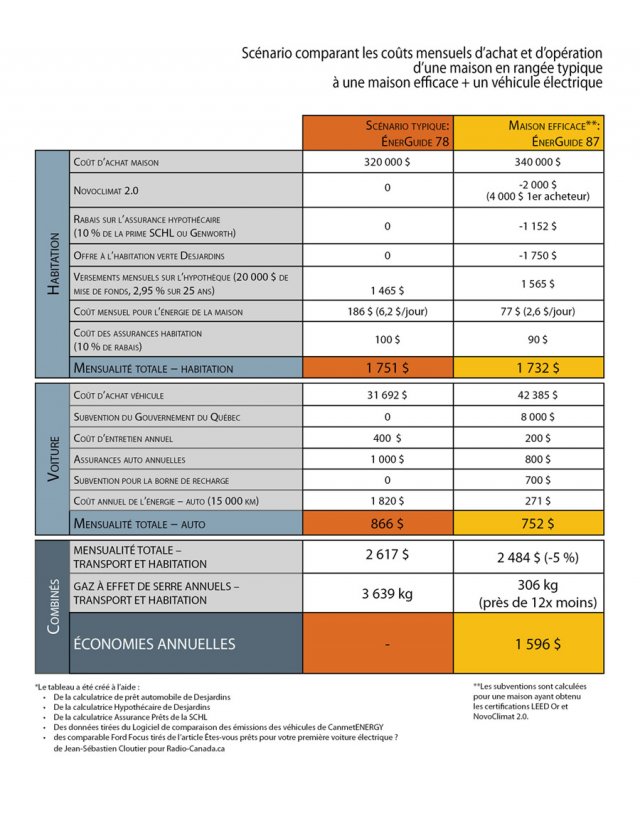 Les économies réalisées avec une maison ayant une cote Énerguide* de 87 et une automobile électrique (comparée à une maison typique et une automobile à essence) s'élèvent à 1 596 $ annuellement.
