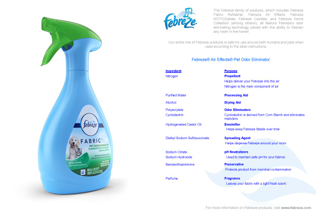 Faites le test! J’ai moi-même essayé de trouver la liste complète des ingrédients d’une bouteille à vaporiser d'un éliminateur d’odeurs pour animaux. Aucune information n’était disponible sur la page produit du site francophone du fabriquant.