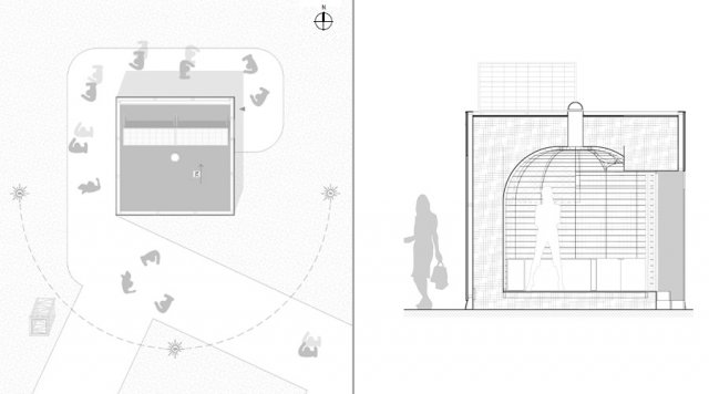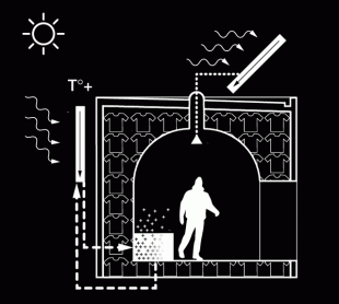 L. McC.: Encastrés au mur sud, les panneaux chauffe-air captent la chaleur du soleil le jour et la stockent dans un banc qui radie son énergie le soir. Au toit, des cellules photovoltaïques chargent des batteries qui alimentent l’éclairage zénithal (puits de lumière au sommet) et l’affichage extérieur en néon DEL à la tombée du jour.