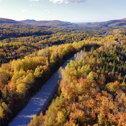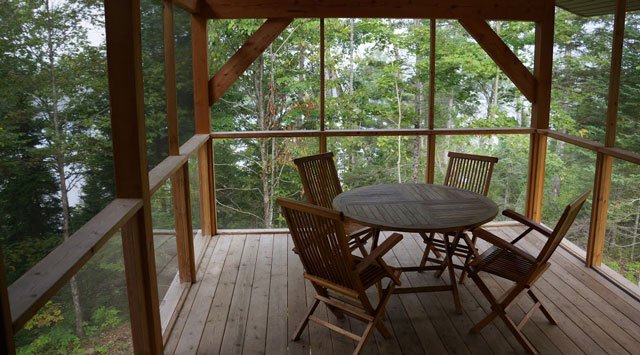 Le faible déboisement effectué pour construire la maison et un jardin représente un peu moins de la moitié d’un acre (22 000 p2). Au nord, à l’ouest et au sud, la forêt est ainsi à moins de 20 pieds de la maison. Au sud-est, une cours herbeuse couvre le champ d’épuration. Finalement, à l’est, une zone de stationnement et des panneaux solaires, situés au nord de la zone, permettent de réduire l’ombrage produit par le couvert forestier. Contrairement à la plupart des maisons construites en face de l’eau, nous n’avons pas éclairci la forêt qui nous en sépare. Nous avons donc un écran visuel devant la rivière, ce qui rend le coup d’œil plus spécial au final.