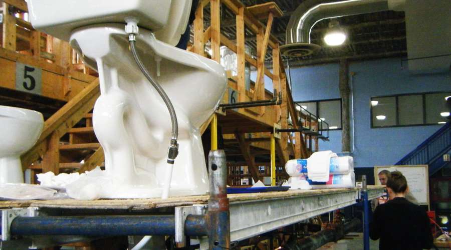 Pour appuyer cette étude, Sara a également entrepris une série d'essais en laboratoire en partenariat avec les professionnels du Centre des technologies de l'tau (CTE) et le cégep de Saint-Laurent. Armés d'un protocole de recherche conçu par un expert du domaine (Bill Gauley, MaP-Testing), l'équipe a monté un banc d'essai dans le laboratoire de l'École des métiers de la construction de Montréal (EMCM) pour tester la performance des toilettes à faible débit dans les situations dites « de pire des cas »; c'est-à-dire une tuyauterie en vieille fonte rugueuse de quatre pouce de diamètre, munie d'un clapet anti-retour en bronze, le tout avec une inclinaison de 1%, soit moins que les 2% habituellement exigés par le Code de plomberie. Ces conditions ont étés précisées par les experts en plomberie des partenaires institutionnels intégrés au projet, incluant la RBQ, la SHQ, l'OMHM et la CMMTQ.
