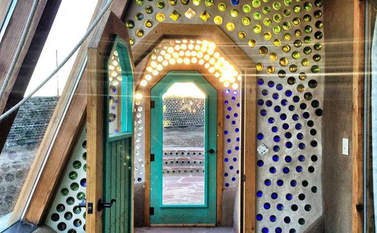La maison est construite à base de matériaux de récupération; des pneus usagés remplis de terre sont utilisés pour la construction des murs. Les briques sont conçues à base de canettes d’aluminium et, pour leur opacité et leur esthétisme, des bouteilles en verre sont souvent utilisées sur les murs intérieurs.