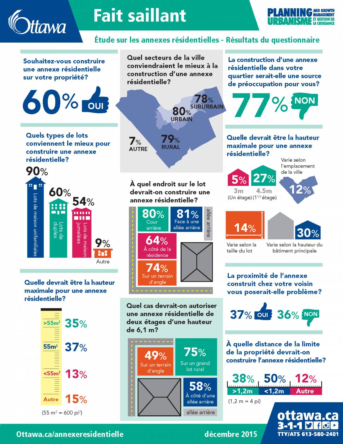 C’est dans ce contexte que la Ville d’Ottawa a réalisé l’automne dernier un sondage auprès de ses citoyens pour déterminer dans quelles circonstances ces logements devraient être autorisés. Bien qu’elle permette déjà les logements secondaires de plein droit dans les résidences principales de toutes les zones résidentielles, la Ville a décidé de les autoriser également dans les constructions accessoires comme les pavillons-jardins ou garages. Le document de base au sondage examine les facteurs entourant l’autorisation de logements secondaires dans des constructions accessoires.