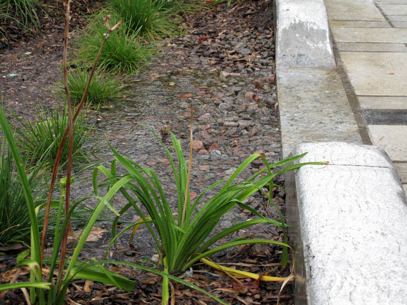 - îlot de biorétention pour favoriser l’infiltration des eaux de ruissellement, la captation des contaminants (huiles et graisses), et le rafraîchissement de l’air lors de l’évaporation. Des puisards ont été intégrés à la planification pour les forts évènements de pluie, mais les plus petites pluies, soit 90% des évènements annuels, sont traitées par les îlots