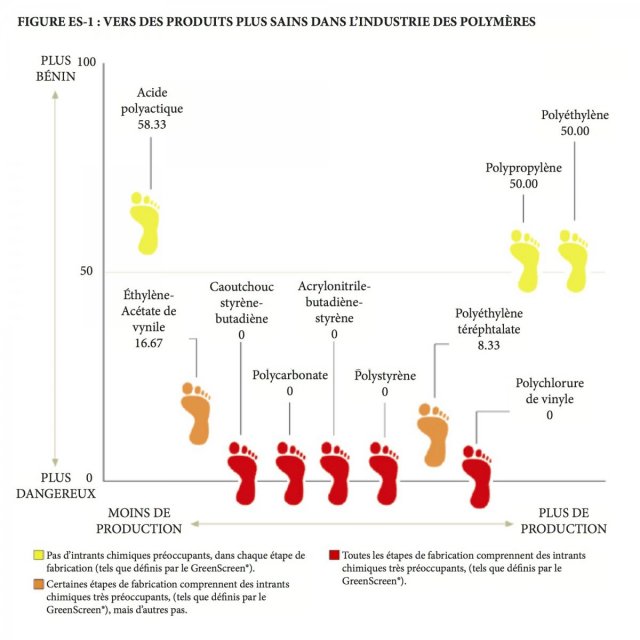 La figure ES-1, en présentant une analyse de l’empreinte des principaux plastiques retrouvés sur le marché, fournit une première piste de réflexion pour l’acheteur, le concepteur et le fournisseur. Si vous devez utiliser du plastique, optez pour l'acide polyactique, le polypropylène ou le polyéthylène, si possible. Idéalement, on évite le polychlorure de vinyle (PVC) et le polystyrène.