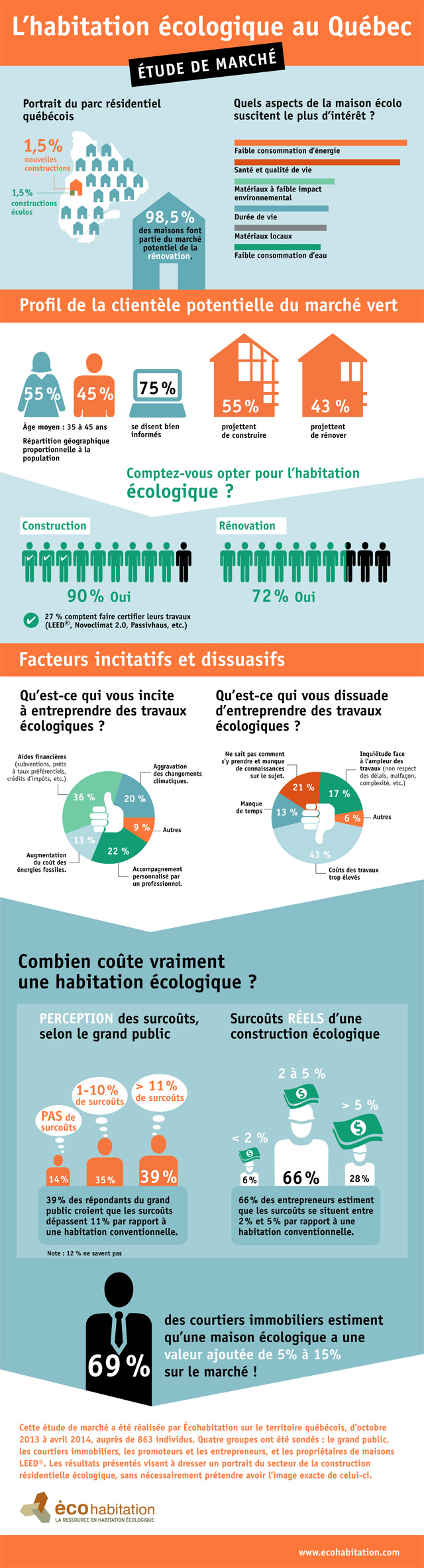 Quel type de personne achète une maison écologique? Se lance dans un projet de rénovation verte? Coûte-t-il plus cher de choisir l’habitation écologique? Et combien cette habitation vaudra-t-elle ensuite sur le marché? C’est à ces questions, et plusieurs autres, qu’a voulu répondre la première grande étude de marché sur l'habitation écologique au Québec, réalisée par Écohabitation.