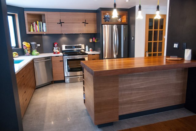 Cuisines Multiplex propose des cuisines rénovées sur mesure, exactement selon le goût du client, avec des caissons écologiques Purebond et des panneaux NuGreen et du bois FSC selon les disponibilités. « Tout est fabriqué au Qubec avec du bois québécois ou est-américain, assure Marika Nelson, cogérante de cette compagnie familiale. Nous incitons nos clients à faire des choix plus durables : on suggère les électroménagers Energy Star et la poubelle à compost, on déconseille le frigo gigantesque, on démontre qu’un four suffit. Et ça marche. » La photo ci-dessous présente une cuisine Multiplex d’une famille de Bromont.