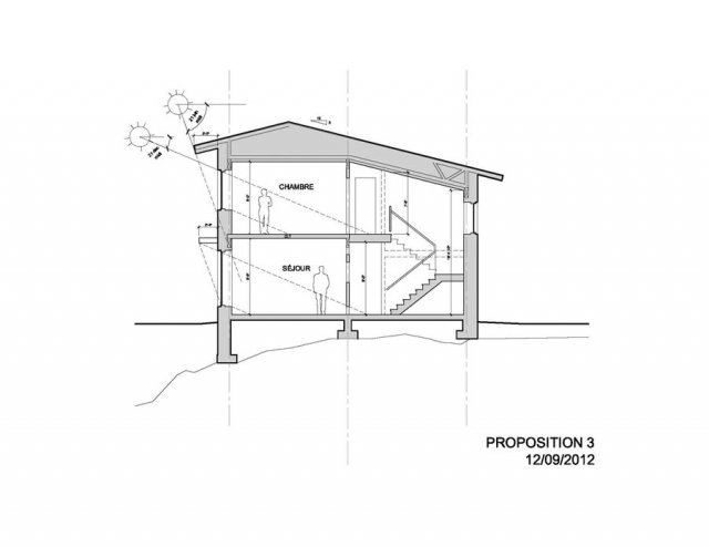- Le schéma ci-dessus, et photo ci-contre, montrent l’effet des débords de toit sur la maison. La plus grande partie des fenêtres est située du côté Sud de la maison car c’est là que le gain solaire est maximal au cours d’une journée. Le vitrage a été soigneusement sélectionné pour permettre le maximum de gains solaires au sud mais une résistance thermique maximale pour les autres orientations.