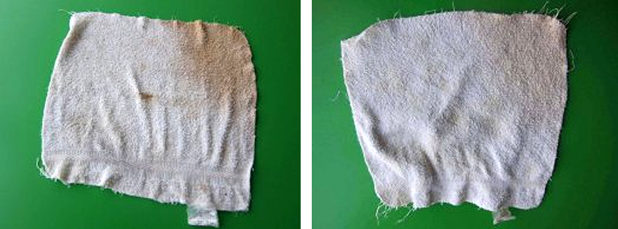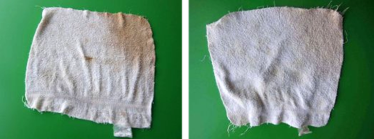 Après le lavage, la tache est toujours présente quoique très pâle. Par contre le torchon n’a plus d’odeur et semble propre. Compte tenu qu’une tache de café n’est pas facile à faire disparaître même avec du savon à lessive conventionnel, je suis plutôt satisfaite du résultat. Je ne l’ai pas remis au lavage. Le site Web de SmartKlean spécifie que la balle ne contient pas d’agent spécifique pour enlever les tâches et suggère d’utiliser le détachant SmartKlean.