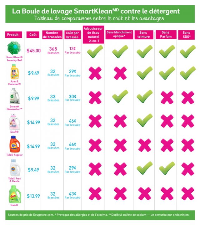 Le fabricant SmartKlean promet de belles économies sur l’achat de détergent à lessive. Une balle permet de faire 365 lavages, soit l’équivalent de 20 à 40 contenants de détergent à lessive selon le produit. Le coût par brassée pour la balle est évalué à 13¢, comparativement à 37¢ en moyenne (entre 29 ¢ et 43 ¢) pour le détergent à lessive conventionnel (voir le tableau ci-dessous, extrait du site). Une balle se détaille à 45$, ajoutez 7,50 $ pour l’envoi postal.