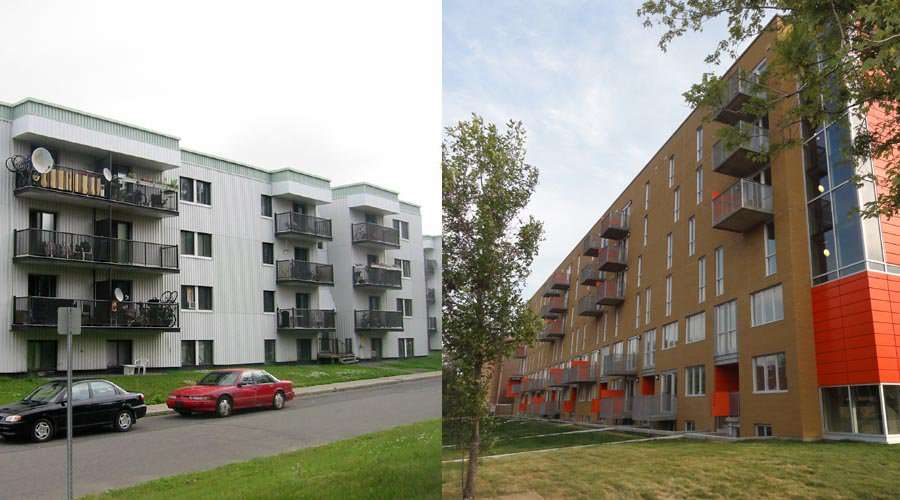« Trois nouveaux immeubles de six étages, d’architecture moderne et certifiés LEED, remplaceront six bâtiments devenus complètement désuets et dont la rénovation s’avérait hasardeuse (..) L’histoire révélera que la décision de repartir à neuf, de la cave au grenier, était la bonne puisque la démolition des bâtiments a exposé la présence d’amiante et de nombreux problèmes de pont thermique, de ventilation, d’infiltration d’eau, de moisissures et de fissuration de l’enveloppe extérieure. (…) Les nouvelles installations offriront le même nombre d’unités locatives que les anciennes, soit 180 logements, mais davantage de superficie pour chacune d’elles, en moyenne 30 % plus grandes. De plus, elles s’intégreront bien à l’environnement du Vieux-Longueuil et briseront l’image de ghettoïsation procurant ainsi un meilleur cadre de vie aux locataires. »