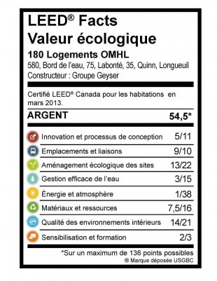 Le projet a obtenu la certification LEED argent avec 54 points sur 136 (voir fiche de valeur écologique ci-après).