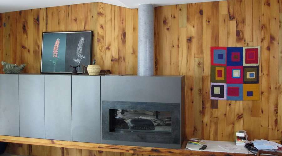 - Murs de la salle de séjour finis en planches récupérées issues du bâtiment; (photo 2)