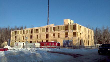 Immeuble à condos à Chibougamau (4 étages, 24 unités). La structure en bois lamellé-croisé vient de Chantiers Chibougamau. Photo Ch. Chibougamau.