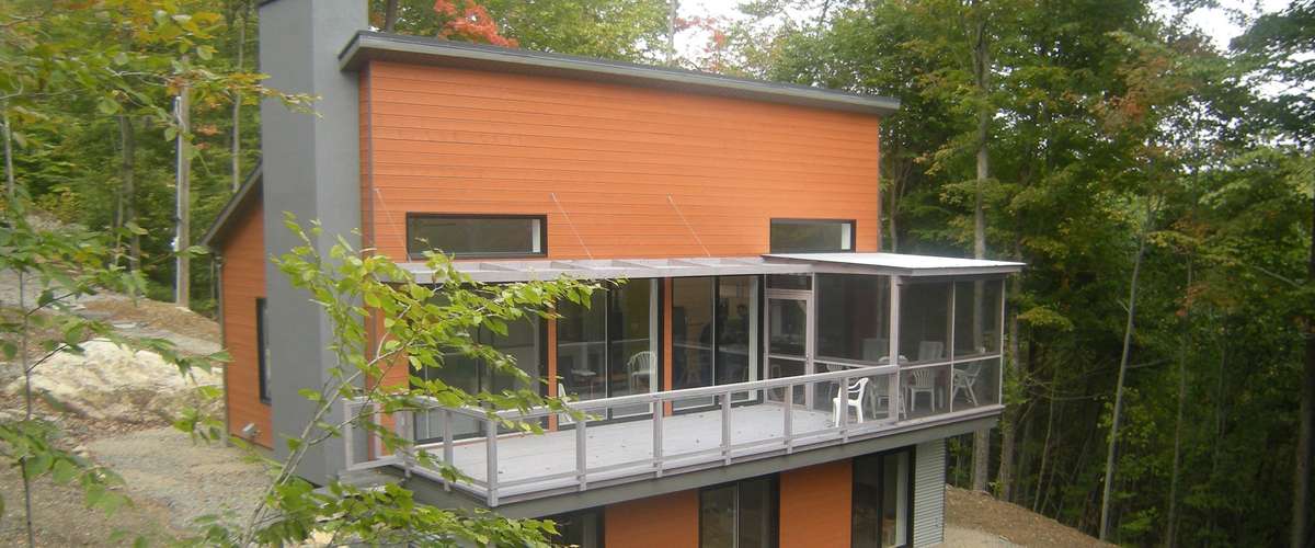 Nathalie Caron, designer, est l’instigatrice de cette maison certifiée LEED-platine, voisine du Parc national du Mont Orford. Avec son projet, elle s’est positionnée en réaction aux « manoirs » et autres « maisons éléphants » que les Québécois se construisent actuellement. Madame Caron voulait donc construire une maison écolo où la superficie serait moindre, où il n’y a pas d’artifices et où la durabilité prime.