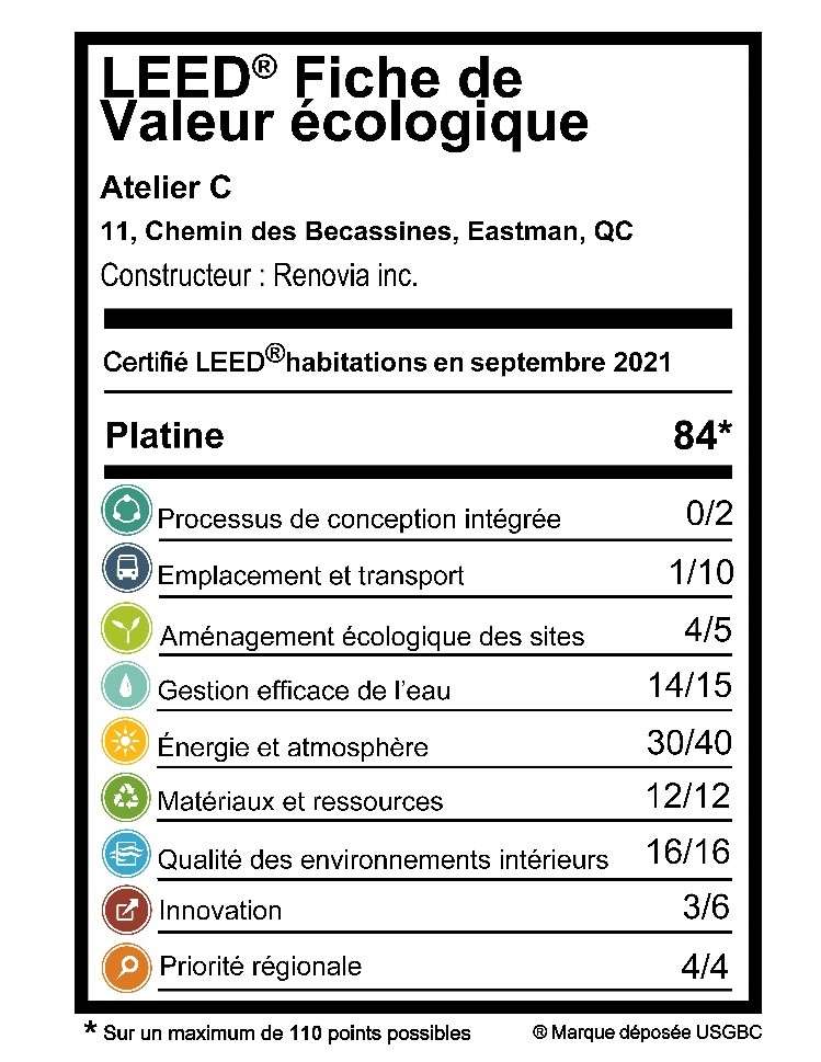Pour Benjamin Zizi, l’évaluateur écologique du projet : « l’Atelier C n'atteint pas le maximum des points LEED en Emplacement, et c'est bien le seul endroit! Sa conception sobre et avancée lui permet d'atteindre une excellente performance écologique à tous les niveaux : consommation d'eau, énergie, confort thermique et aménagements paysagers. On retiendra notamment les innovations en matière de charpente (poutrelles en I), l'excellence de l'enveloppe thermique (atteinte avec principalement de la cellulose, un matériau que l'on apprécie beaucoup pour son faible impact environnemental), et l'extrême attention apportée à l'étanchéité à l'air (en dessous des seuils de PassivHaus). Les choix intérieurs prouvent également que l'on est capables de faire des choix modernes et design tout en réduisant son impact écologique. C'est la signature d'un projet avec de nombreux efforts sur la conception et la réalisation ! »