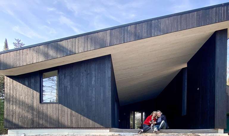 L’objectif d’une certification LEED niveau platine était bien ancré dès le départ chez Caroline et Ronny. Pour concrétiser leur projet, ils suivent d’abord les formations Écohabitation : Écoconstruction pour pros et Je construis ma maison écologique : le parcours. Ensuite, à pied d’œuvre, le défi a été énorme pendant la construction : difficulté pour obtenir certains matériaux, manque de main-d’œuvre et contexte pandémique ont constitué de réelles embûches. « Nous avons aussi vite réalisé que les dépassements de coûts et les « tant qu’à y être » faisaient partie de l’aventure. » Finalement, le succès était au bout des efforts déployés : obtention d’un LEED platine avec un pointage de 84/110 ! « Ce fut un très grand défi, mais combien stimulant et satisfaisant quand on regarde le résultat. ». L’entrepreneur général Ronny Thériault, de Renovia, visait le plus haut niveau de la certification LEED pour les habitations. Avec sa femme, Caroline, le couple, respectivement musicien et auteure à temps partiel, a baptisé leur maison Atelier C, pour créativité.