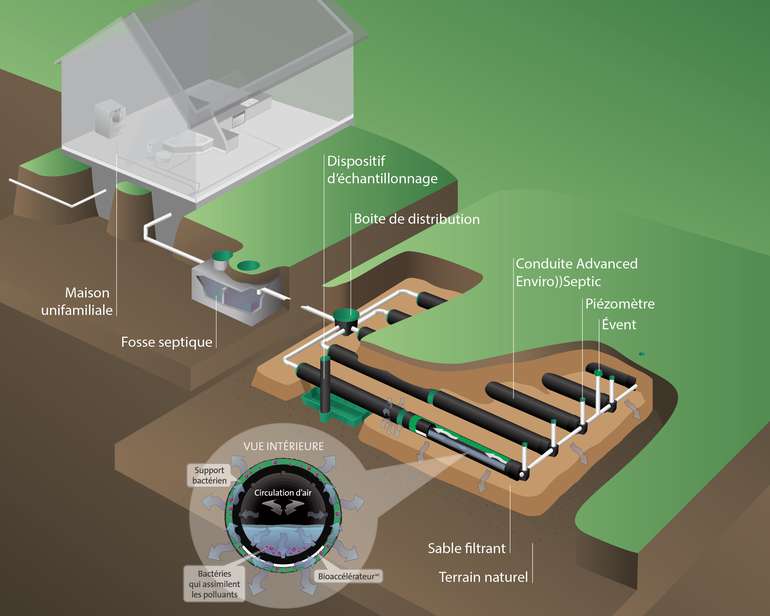 Un système de traitement des eaux usées domestique remplit deux fonctions : il facilite le traitement de l'eau en provenance de la fosse septique et permet l'évacuation des eaux de façon sécuritaire dans l'environnement.