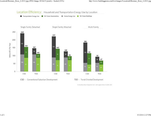 Le U.S. Environmental Protection Agency (EPA) vient tout juste de publier un rapport sur « l’efficacité de la localisation » - qui sous-tend l’idée que l’endroit où nous vivons à un impact majeur sur notre consommation énergétique. Dans un quartier résidentiel typique, une maison consomme normalement 108 millions de BTU par année – chauffage, ventilation, électricité, etc.). Mais le ménage qui habite cette même maison utilise environ 132 BTU annuellement pour son déplacement. En d’autres mots, 55 % de l’énergie totale consommée par une famille est utilisée pour le transport.
