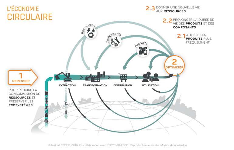 Québec circulaire, une plateforme de référence en économie circulaire animée par le CERIEC, définit l’économie circulaire comme « un nouveau modèle économique qui vise à découpler la croissance économique de l'épuisement des ressources naturelles et des impacts sur l'environnement par 2 principaux mécanismes :